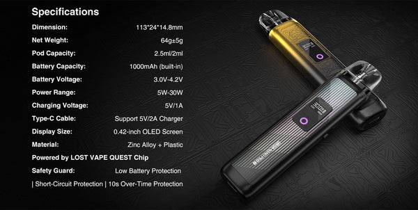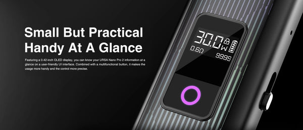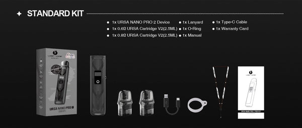 Lost Vape Ursa Nano Pro 2 Kit is powered by an advanced Quest 2.0 Chip and a built-in 1000mAh battery, accommodating 2.5ml of e-juice, boasting a 30W maximum output power, and incorporating multiple protective measures. It adopts smooth airflow adjustment to better suit your taste preference. Ursa Nano Pro 2 Kit is designed with a ring-shaped RGB indicator to show you the charging state, 0.42 inch OLED display to show you vaping info more intuitively and a multifunctional button to bring you more convenient use. It is compatible with Ursa Cartridge V1/V2 to meet your RDL or MTL preference.