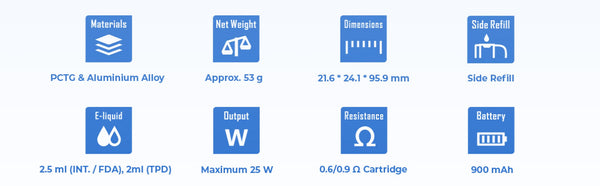 E-liquid Capacity: 2.5ml(INT./FDA), 2ml(TPD)