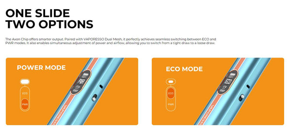 The Axon Chip offers smarter output. Paired with VAPORESSO Dual Mesh, it perfectly achieves seamless switching between ECO and PWR modes. It also enables simultaneous adjustment of power and airflow, allowing you to switch from a tight draw to a loose draw.