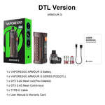 The Vaporesso ARMOUR G Pod Mod Kit Featuring patented Mega Batt technology,and boasts a 3000mAh battery that maintains a compact size while delivering 80W of power, making it more portable than ever. It uses the latest Neo PULSE MODE and COREX technology, providing stronger output and enhanced flavor consistency. The ARMOUR G pods utilizes top airflow and top-fill design, significantly reducing the risk of leakage.The ARMOUR G Series pod is also compatible with GTX coil platform, making it more accessible for you.Additionally, the overall user interface experience has been further refined, offering users more stylish options.